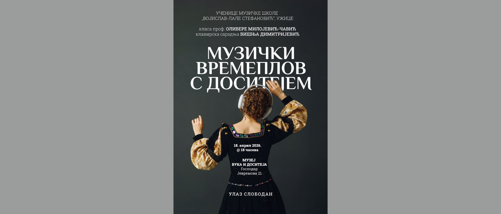 Ученице класе соло певања професорке Оливере Милојевић-Чавић из Музичке школе ,,Војислав-Лале Стефановић” представиће београдској публици музику Доситејевог времена кроз песме. На клавиру ће их пратити Вишња Димитријевић.